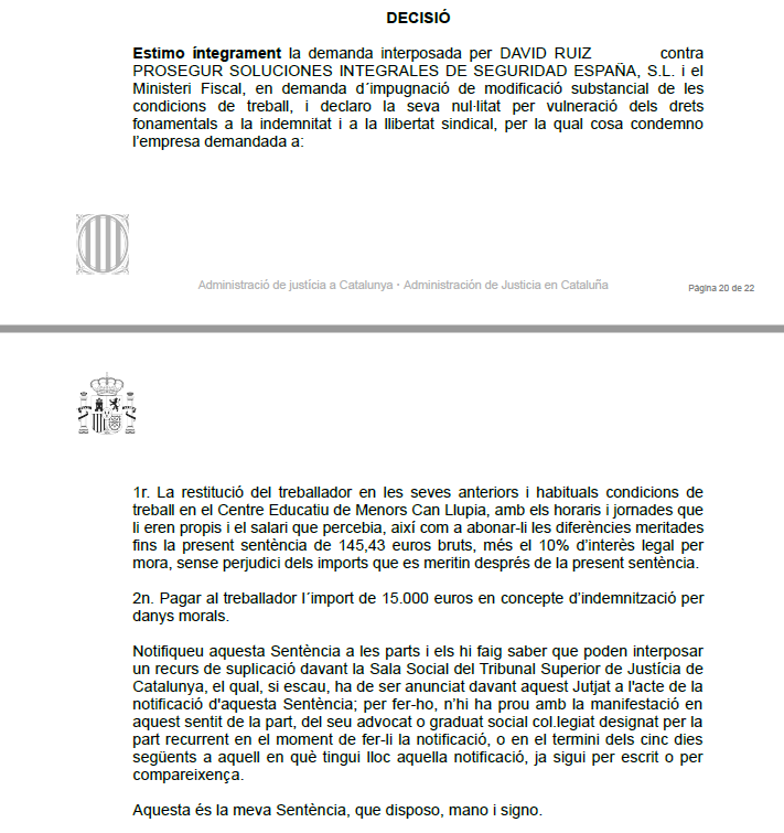 Durísima sentencia del Juzgado de lo Social número 1 de Barcelona, que condena a Prosegur a indemnizar con 15.000 euros a David Ruiz, Vigilante de Seguridad y miembro de la sección sindical de FORT, por daños morales derivados de la vulneración de sus derechos fundamentales a la indemnidad y a la libertad sindical. Además, la empresa deberá restituirlo en su puesto anterior en el centro de menores de Can Llupià.