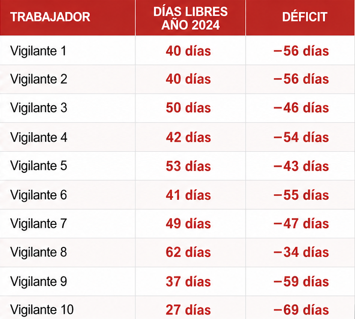 Los hechos constatados por la Inspección de Trabajo no son errores puntuales ni excepciones. Son el resultado de un modelo de gestión lamentable y de dejadez absoluta que convierte a los Vigilantes de Seguridad en trabajadores sin derechos: sin descanso, sin tiempo libre, sin vida fuera del trabajo y que no hace más que confirmar que estamos en un sector precario.