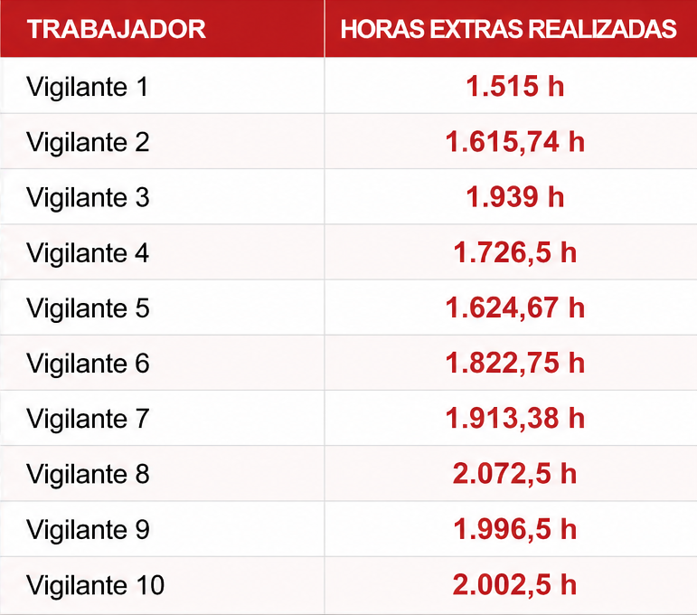 El Estatuto de los Trabajadores fija un máximo de 80 horas extraordinarias anuales por trabajador. Los 10 vigilantes analizados superaron este límite de forma masiva: