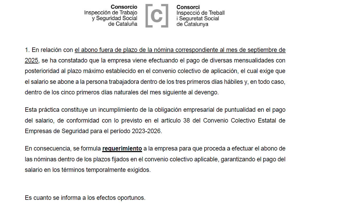 Por ello, se le ha extendido requerimiento para que deje de abonar tarde las nóminas y cumpla, de una vez, con lo dispuesto en el articulo 38 de Convenio colectivo estatal de empresas de seguridad: